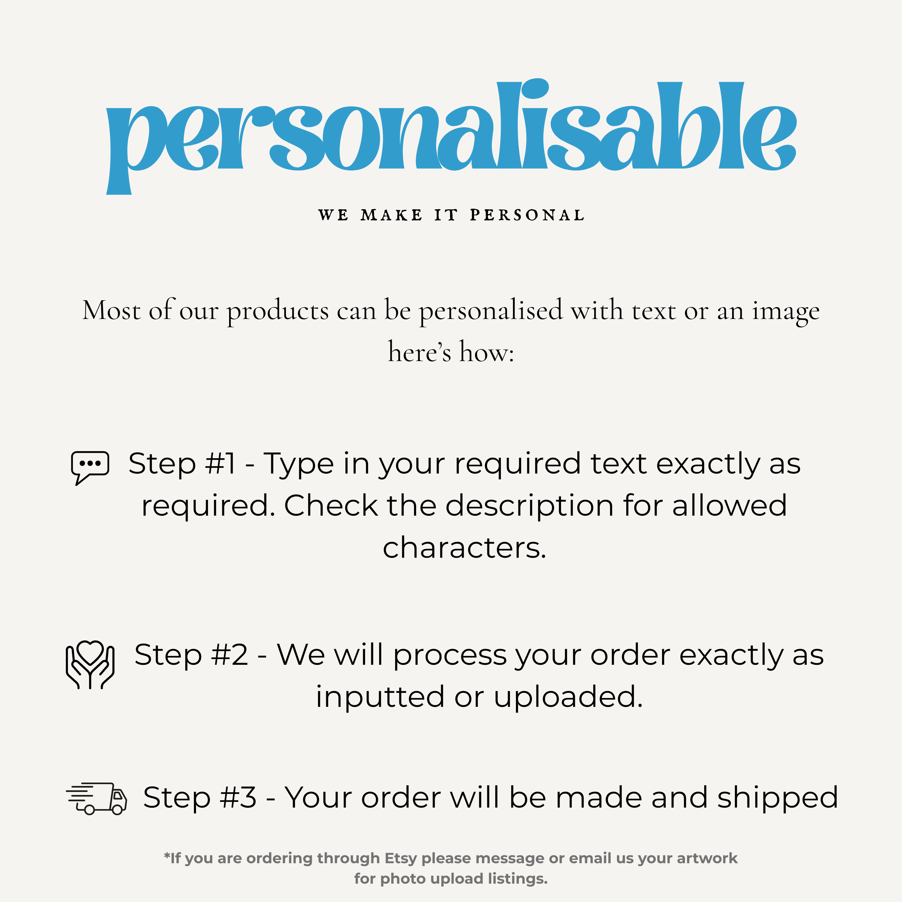 Please insert your chosen message! Some products can be personalised with a unique photo. Please check the description for the preset texts and character count allowed.