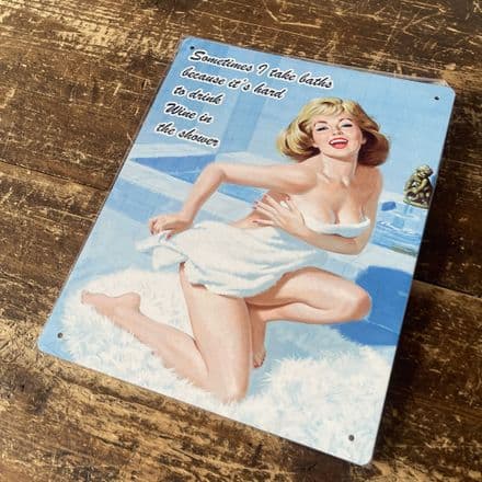 Sometimes I Take Baths Hard To Drink Wine Shower - Pin Up Girl - Metal Travel Wall Sign
