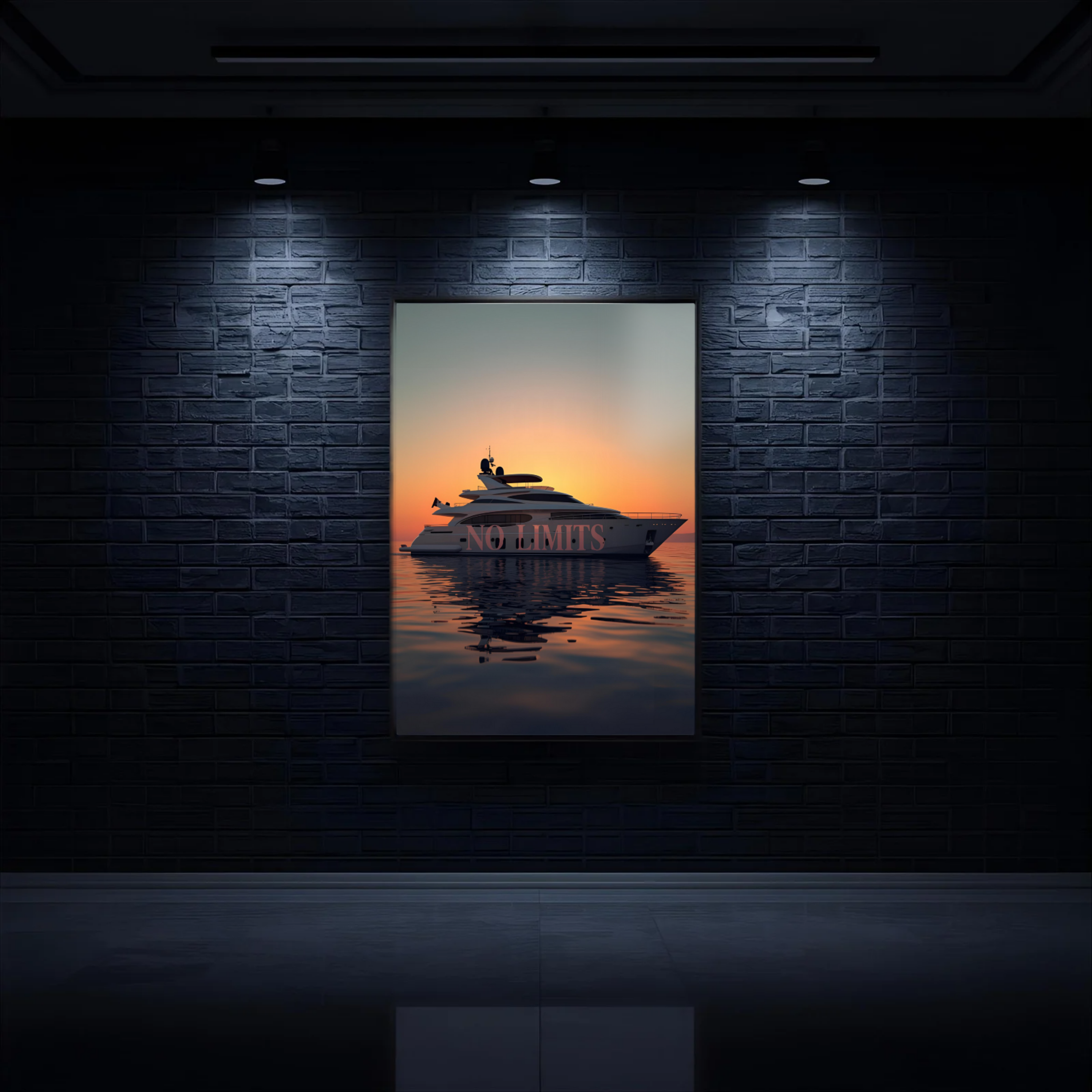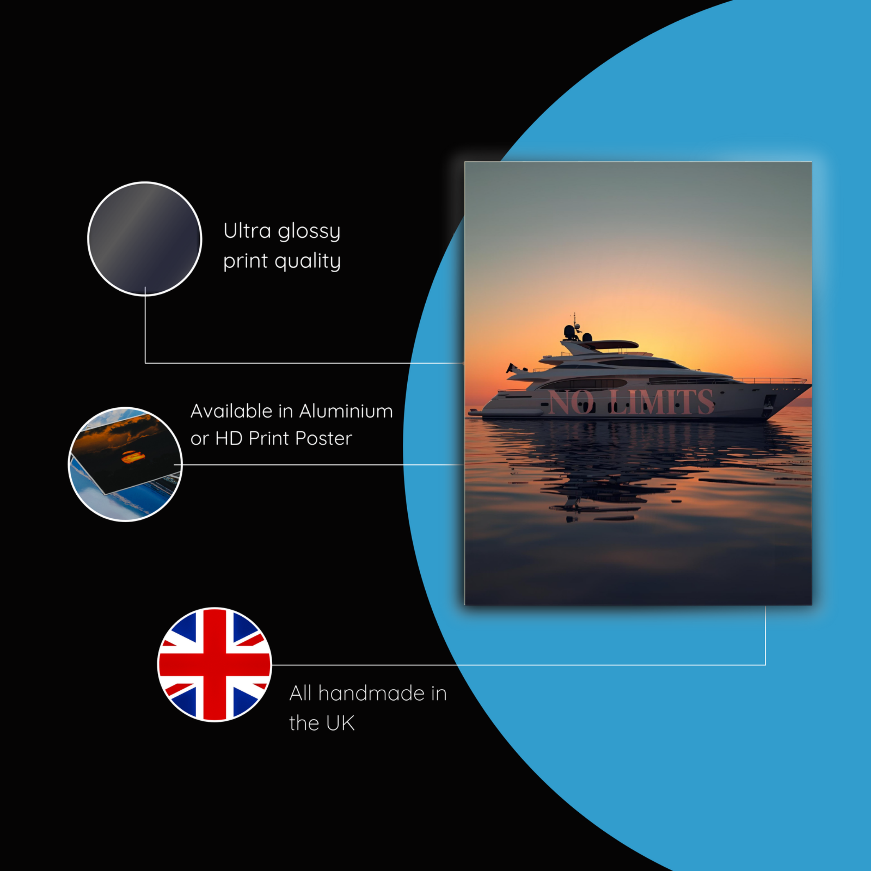 Inspire ambition and elevate your space with this No Limits motivational metal wall art. Featuring bold, modern typography displayed along the side of a sleek yacht, this premium poster captures the spirit of adventure, luxury, and limitless potential. Perfect for offices, home bars, man caves, or any space where motivation meets style.
