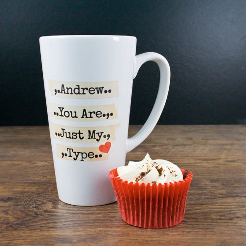 Typewriter style design Large latte mug Design printed on both sides 'You are just my type' comes as standard Personalise with name Dishwasher and microwave safe.