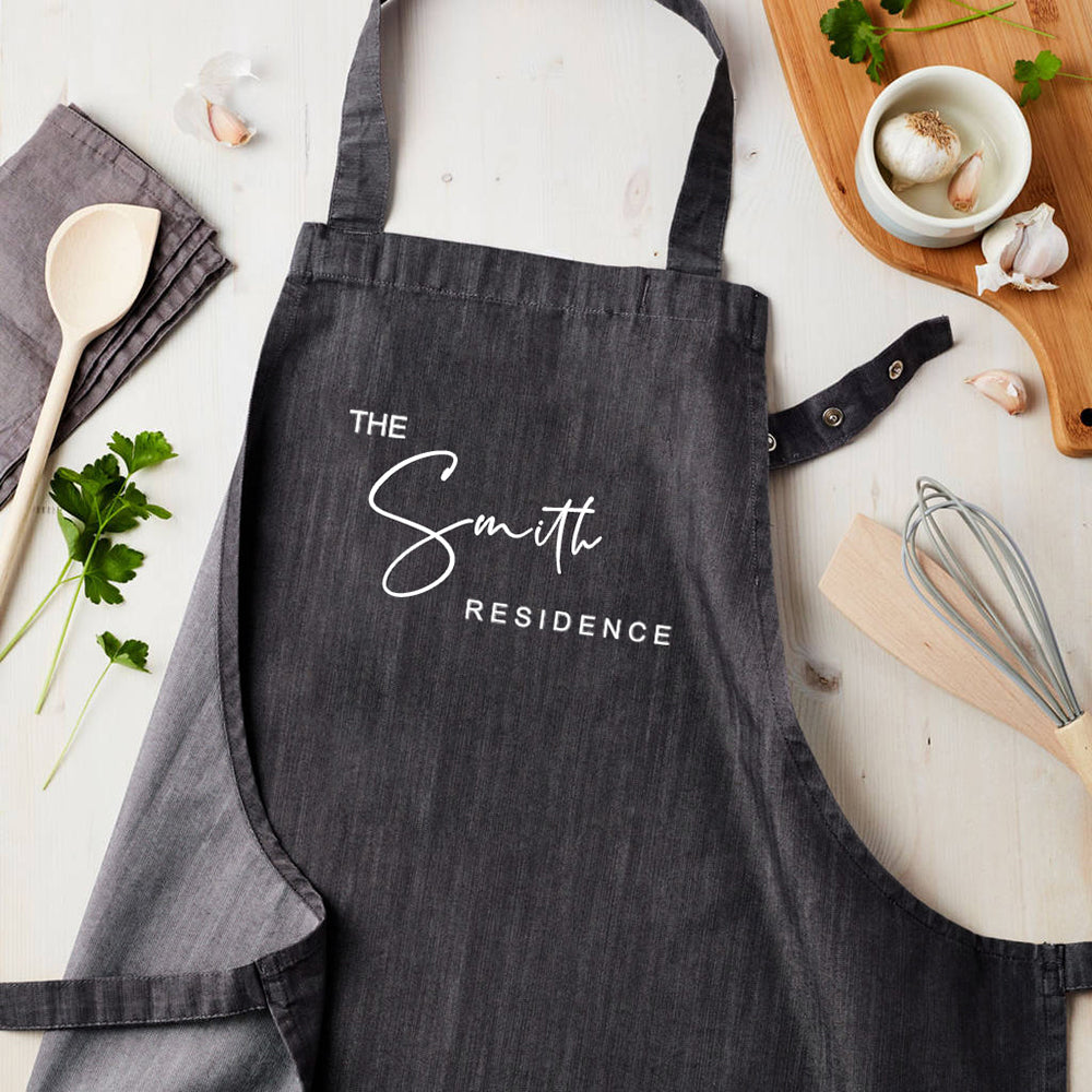 Elevate your cooking experience with our Personalised Grey Denim Family Residence Apron. Crafted from durable denim, it offers both style and protection. Personalize it to celebrate your family’s unique identity. A thoughtful gift that blends practicality with a personal touch—perfect for any kitchen.